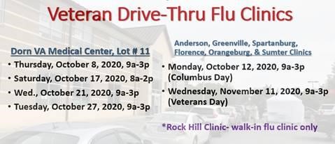 Veteran Drive-Thru Flu Clinics Drive up & roll-up-your-sleeve has been a huge success for Veterans’ flu vaccination. Veterans can receive their flu shots at the Columbia VA, surrounding CBOCs, and our community partners: Costco, CVS, Kroger, and Walmart!