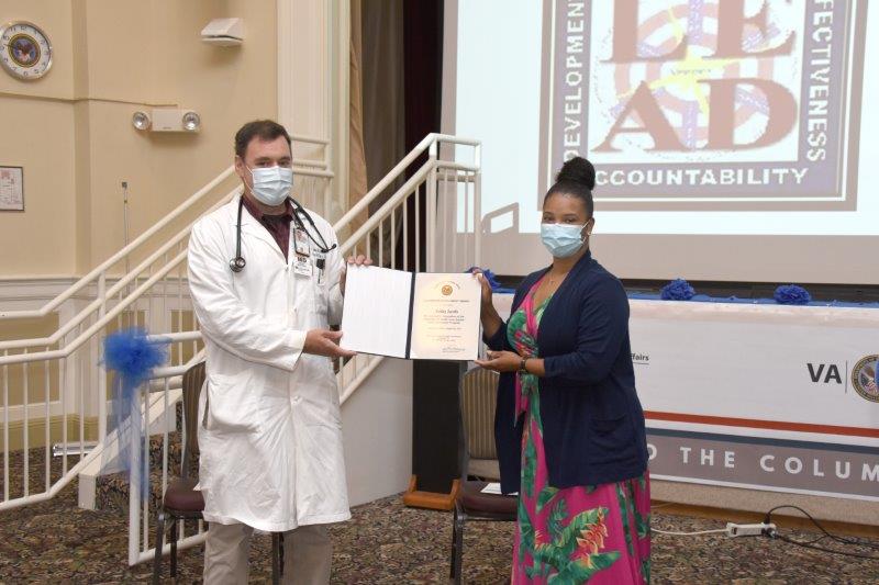 project title: "Cultivating a Positive Work Culture: One Unit at a Time". The VA LEAD program is a one-year developmental program for highly motivated employees who have the desire to learn and work extra hard to develop their leadership skills.Ashley is receiving a LEAD certificate from Dr. James McCallum, Chief of Education in the photo above. Congratulations, Ashley Jacobs!